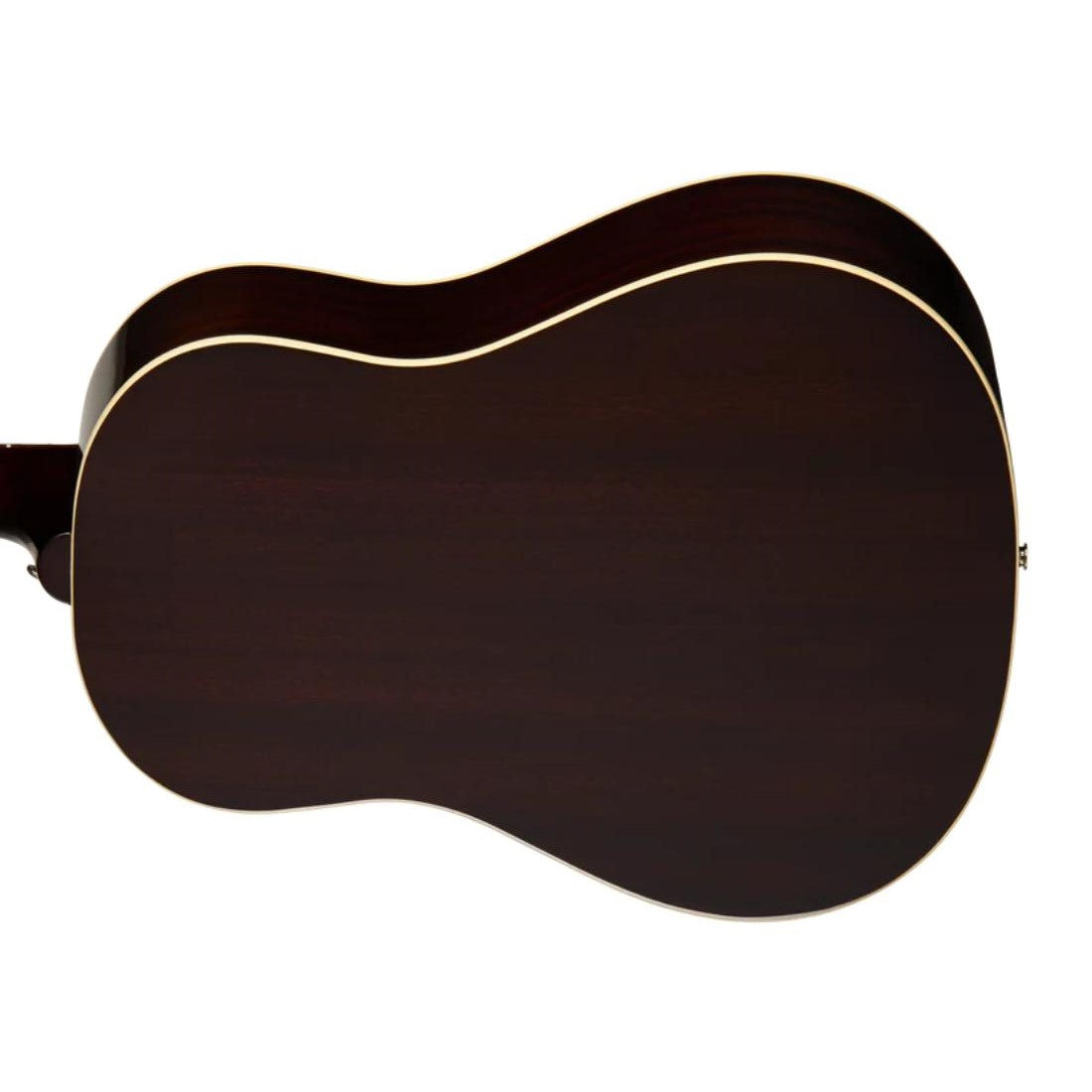 The neck is topped with a rosewood fretboard equipped with 20 standard frets and dressed up with simple pearloid dot inlays. The other ends of the strings are routed over a compensated plastic saddle and are anchored to the belly-up rosewood bridge with ivory-colored bridge pins. We also included other details that give the J-45 Studio even more vintage-style visual appeal, including a teardrop-shaped dark tortoise shell-colored pickguard, three-on-a-plate tuners with ivory-colored plastic buttons, and a 60s Kalamazoo-style headstock with the Epiphone logo proudly displayed in gold silkscreen. The J-45 Studio comes with Fishman electronics, including an S-Core under-saddle pickup and Fishman Presys VT preamp with soundhole-mounted volume and tone controls that are fast and easy to access for the player while remaining nearly invisible to the audience. The Epiphone J-45 Studio has a gloss finish and is offered in two vintage-inspired colors—Natural and Vintage Sunburst. Both right and left-handed versions are available. A standard gig bag is also included.