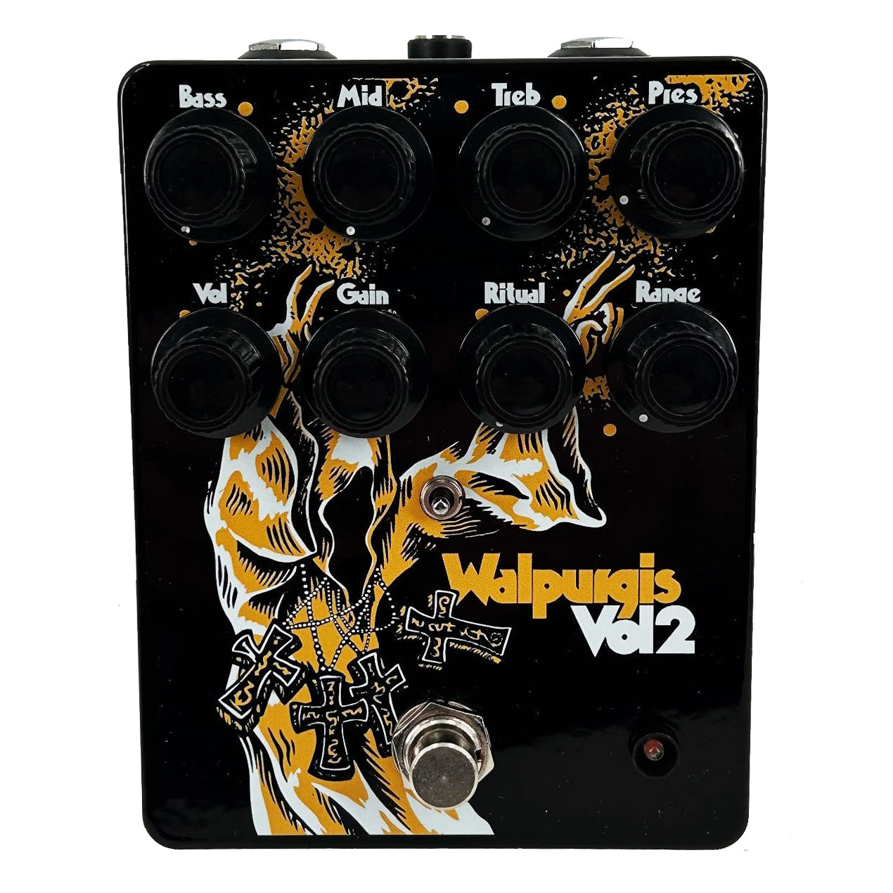 Featuring an internal 36V of headroom for authentic tube-like tone and response, the Walpurgis Vol2 is a JFET based emulation of the preamp section of a late ‘60s Laney Supergroup amplifier with the Ritual knob controlling the level of a modified Rangemaster boost.