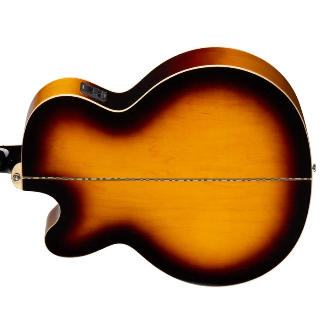 We also included other features that give the J-200 Studio EC even more vintage-style visual pizazz, including an iconic J-200 style tortoise shell-colored pickguard with classic two-color J-200 graphics, Epiphone Deluxe tuners with Keystone buttons, and a bound 60s Kalamazoo-style headstock with the Epiphone logo and Gibson Crown proudly displayed in mother of pearl. The J-200 Studio EC comes with Fishman® electronics, including an S-Core under-saddle pickup and Fishman Presys II preamp with side-mounted volume, bass, treble, and phase controls. It also has a convenient built-in electronic tuner that makes tuning up quick and easy. The Epiphone J-200 Studio EC has a gloss finish and is offered in two vintage-inspired colors—Natural and Vintage Sunburst. Both right-handed and left-handed versions are available. A standard gig bag is also included.