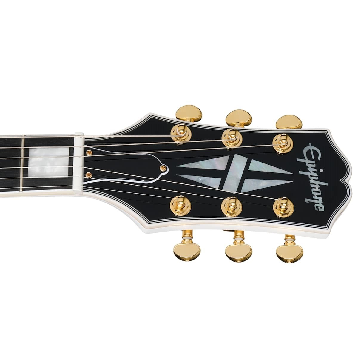 The Epiphone SG Custom has a contoured, double-cutaway mahogany body that delivers exceptional access to all 22 frets. The glued-in mahogany neck adds to the model’s renowned sustain. The neck has a 1960 SlimTaper C profile that isn’t quite as thin as some SlimTaper neck profiles but is still fast and comfortable to play. The neck is capped with a bound ebony fretboard equipped with 22 medium jumbo frets and is adorned with Custom pearloid block inlays. The 12” fretboard radius is equally comfortable and well suited for first-position chording and for string bends further up the neck without the risk of your bends fretting out. The Epiphone SG Custom is outfitted with gold hardware throughout, right down to the gold inserts on the black Top Hat control knobs. The bound headstock has Grover® Mini Rotomatic® tuning machines and is adorned with the Epiphone logo and Custom Split Diamond inlay, both in mother of pearl. The Grover tuners, Graph Tech nut, and the fully adjustable Epiphone LockTone Tune-O-Matic bridge and Stop Bar tailpiece all work together to keep the tuning stability and intonation on point.