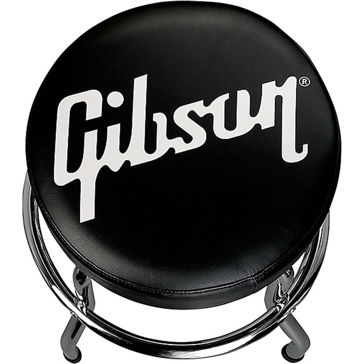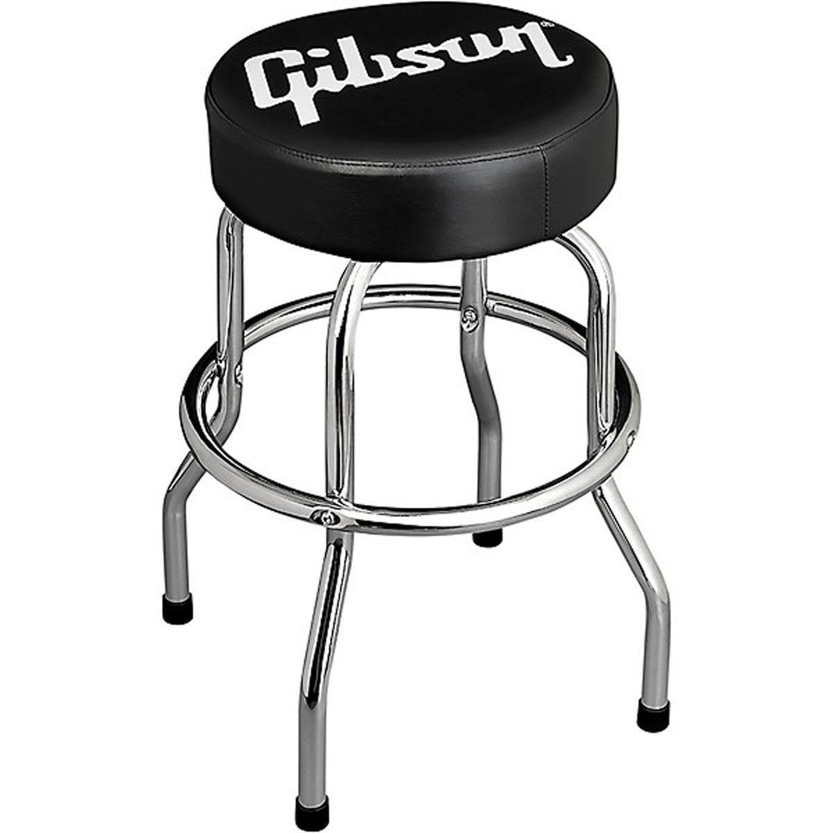 This 24" high playing stool, adorned with the Gibson logo, features a comfortable, padded vinyl seat that swivels through 360 degrees. The classic barstool-style tubular steel legs have a chrome finish, and the stool has a foot ring for added comfort.