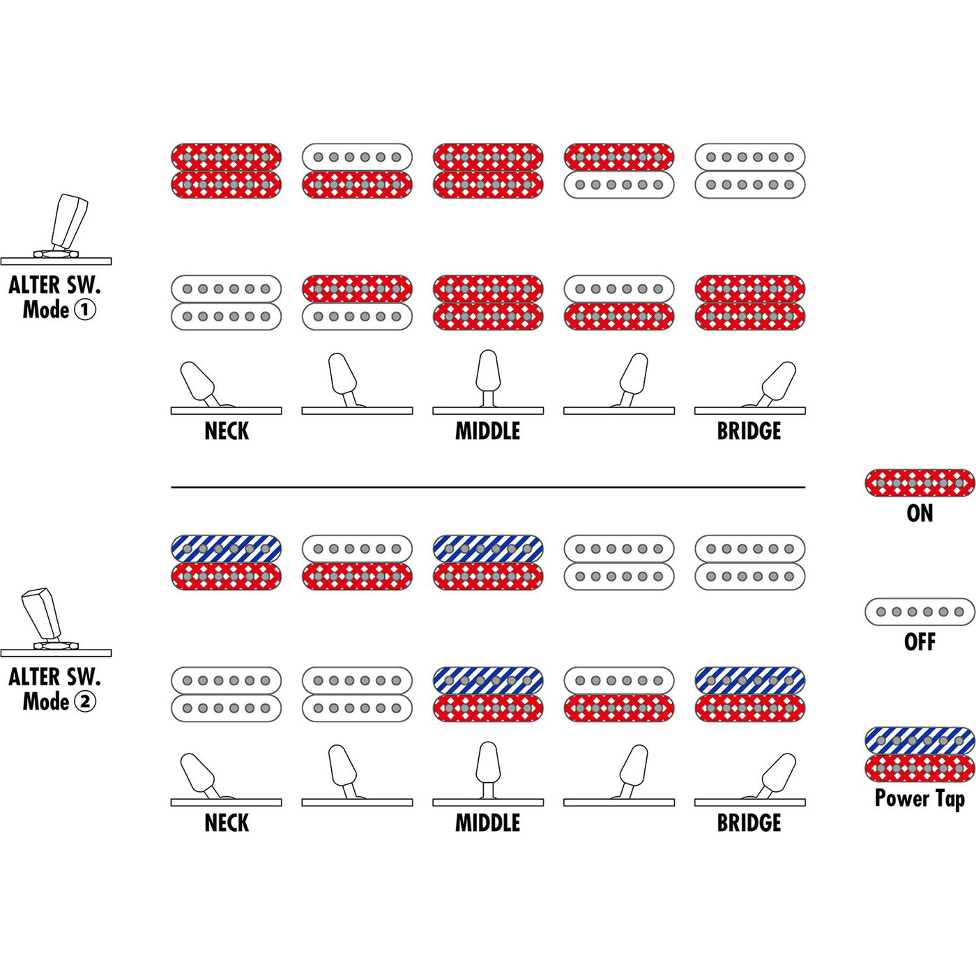 The dyna-MIX 10 offers ten sound variations and can easily switch from humbucker and single coil modes with the mini switch. The power Tap mode provides a realistic single coil sound despite its two humbucker pickup layout.