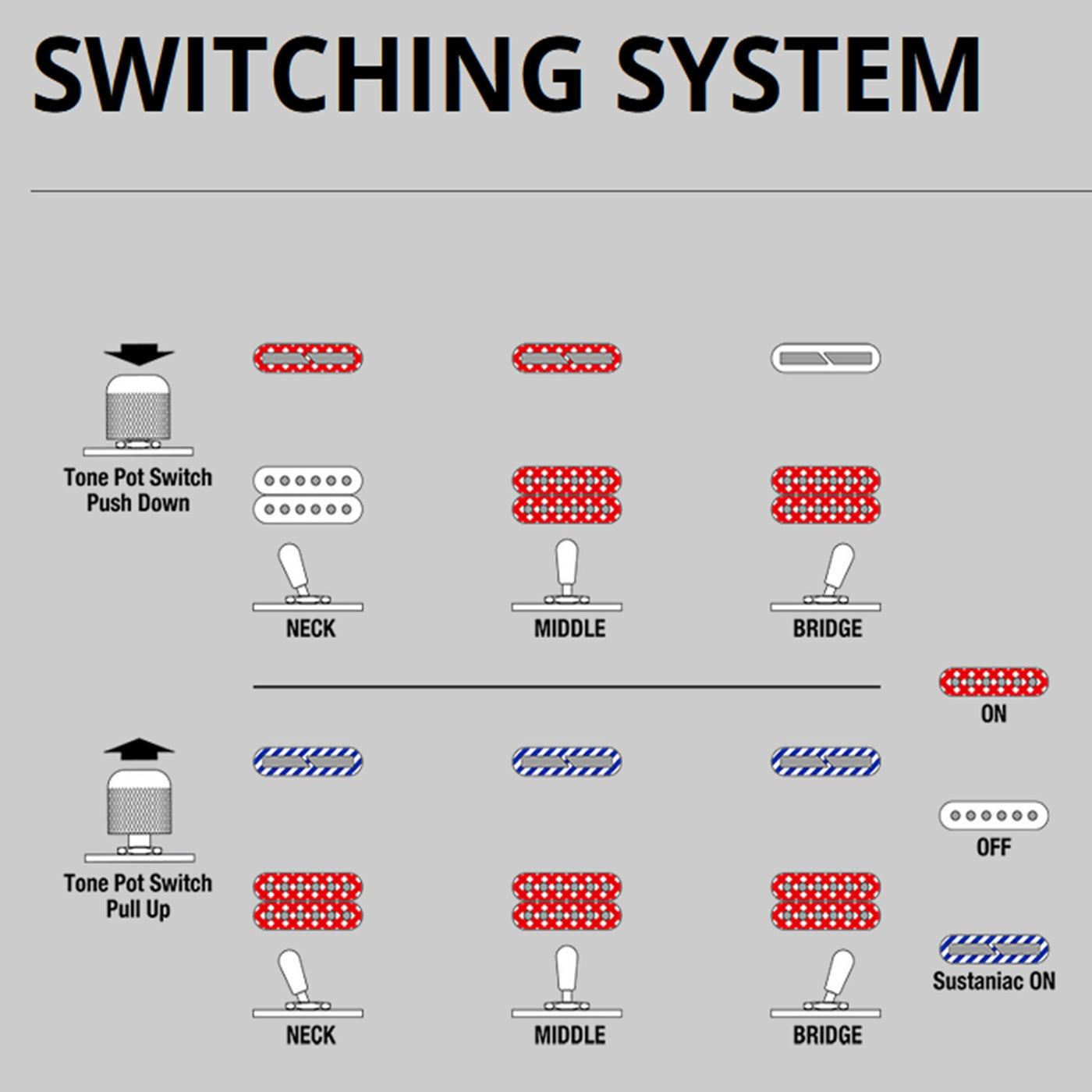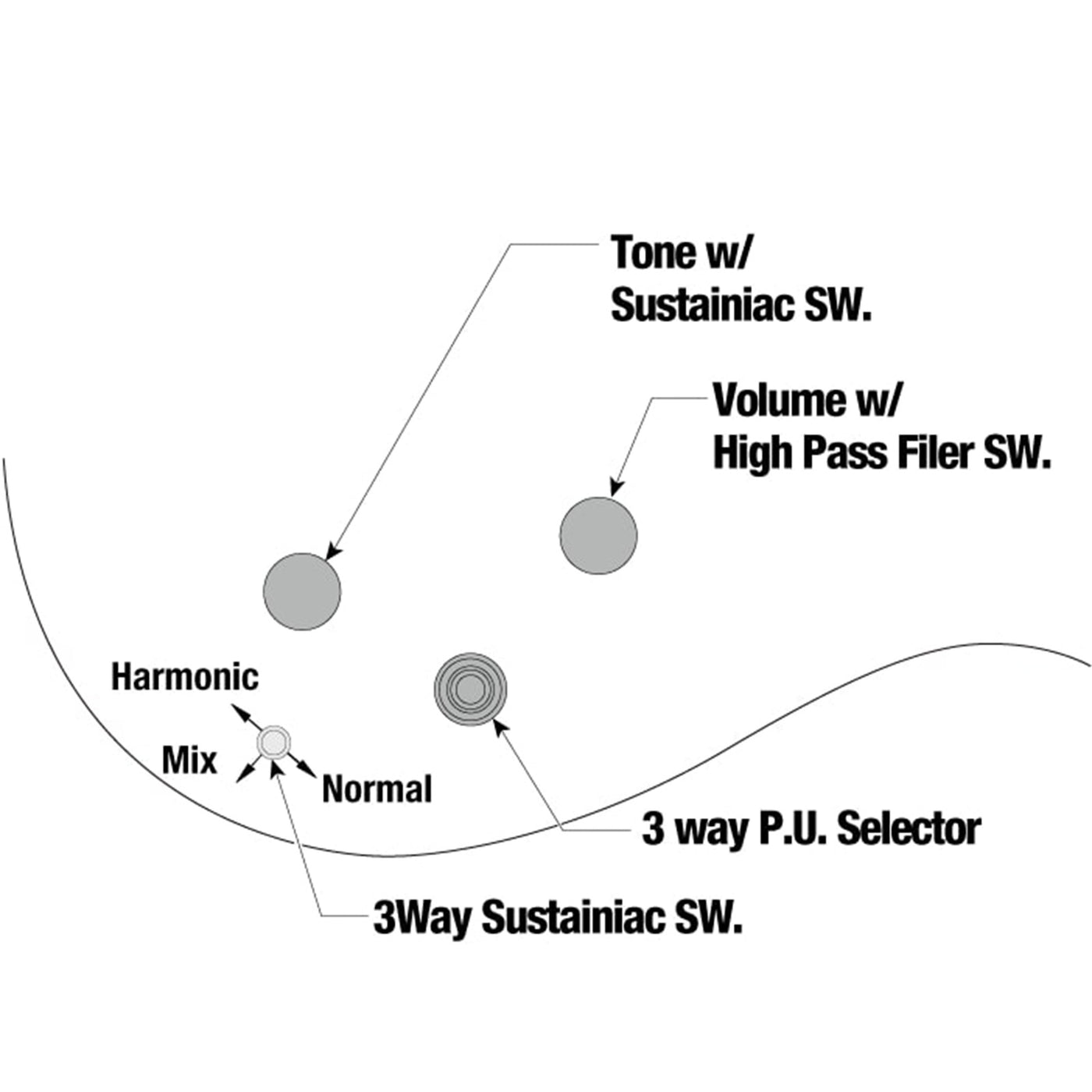 The Satchur8 humbucker delivers a wide tonal range, complemented by a Sustainiac neck pickup for controllable infinite sustain. A highpass filter sharpens your sound for mix-cutting clarity.