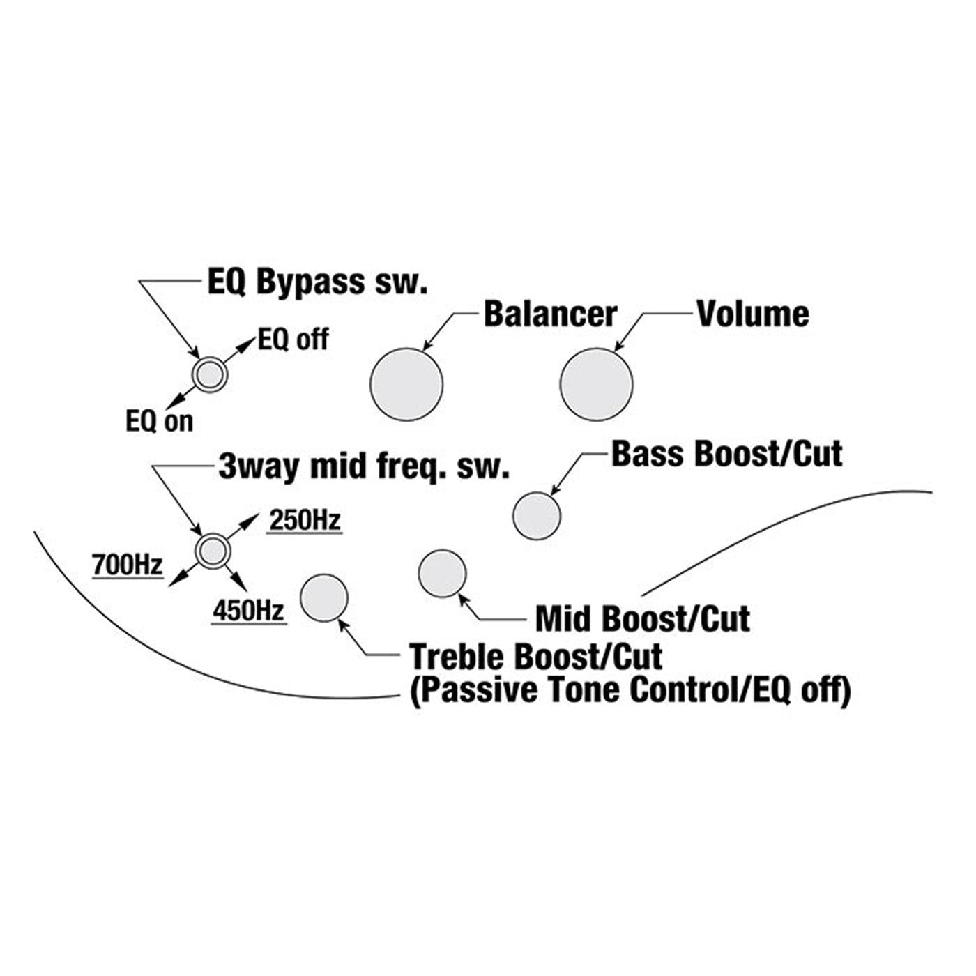 • equaliser: Ibanez Custom Electronics 3-band EQ w/ EQ bypass switch (passive tone control on treble pot), 3-way Mid frequency switch