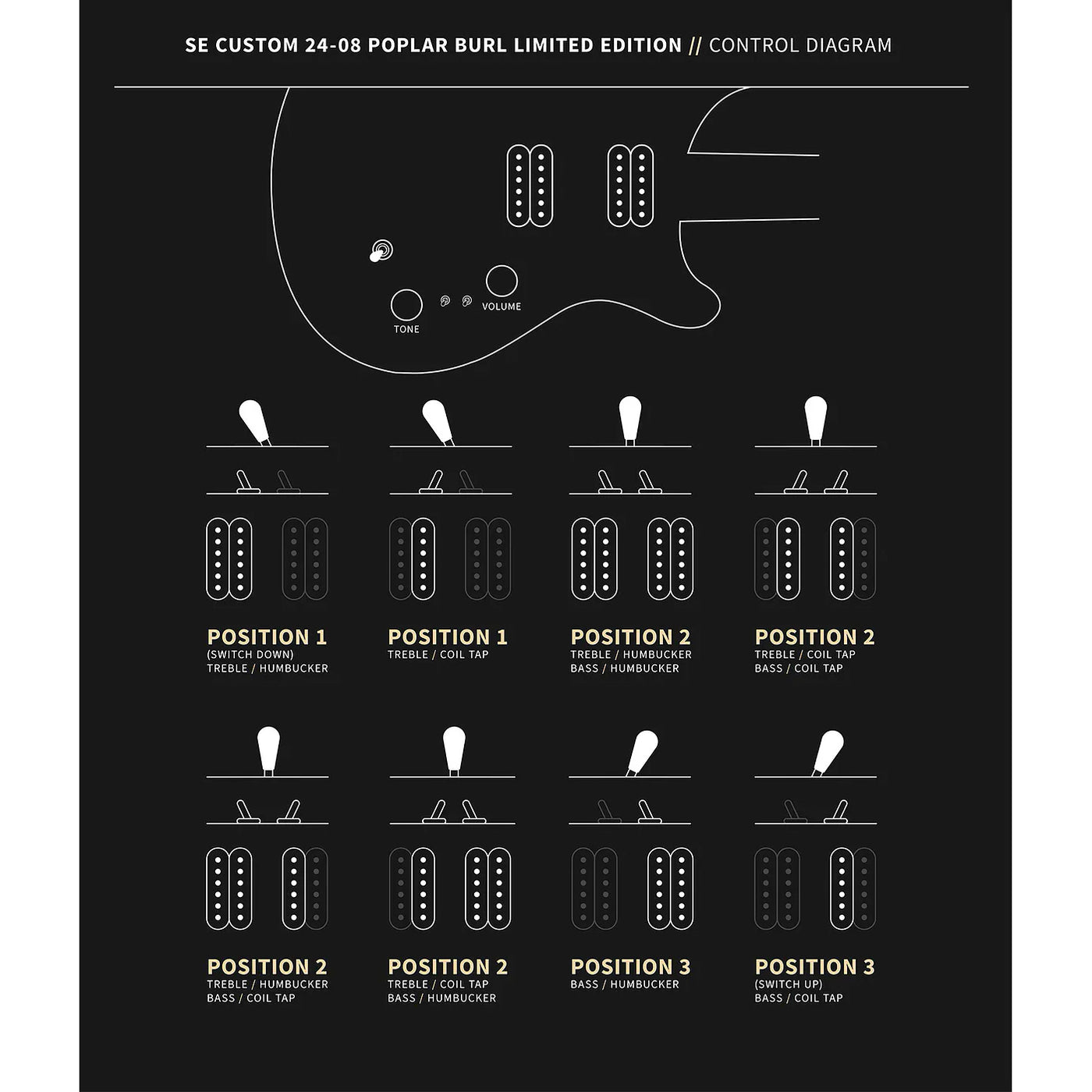 • Controls: Volume and Tone Controls with 3-Way Toggle Pickup Switch & Two Mini Toggle Coil-Tap Switches