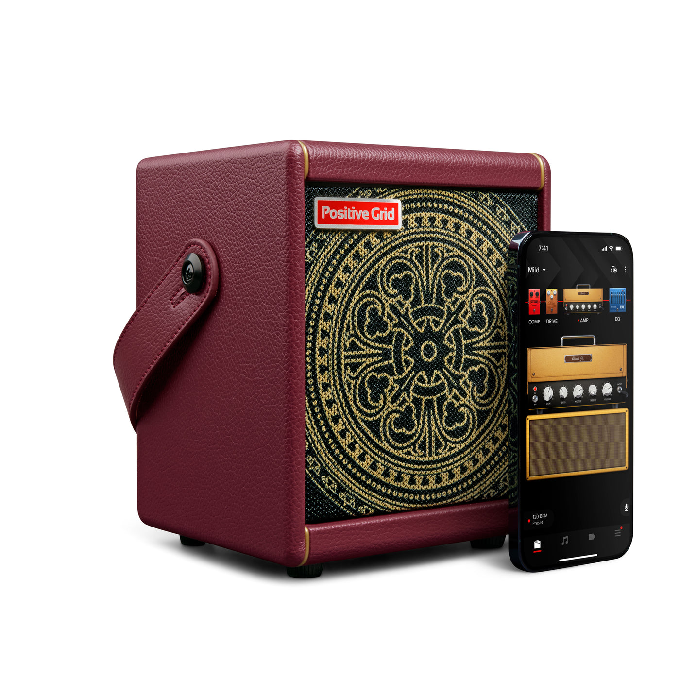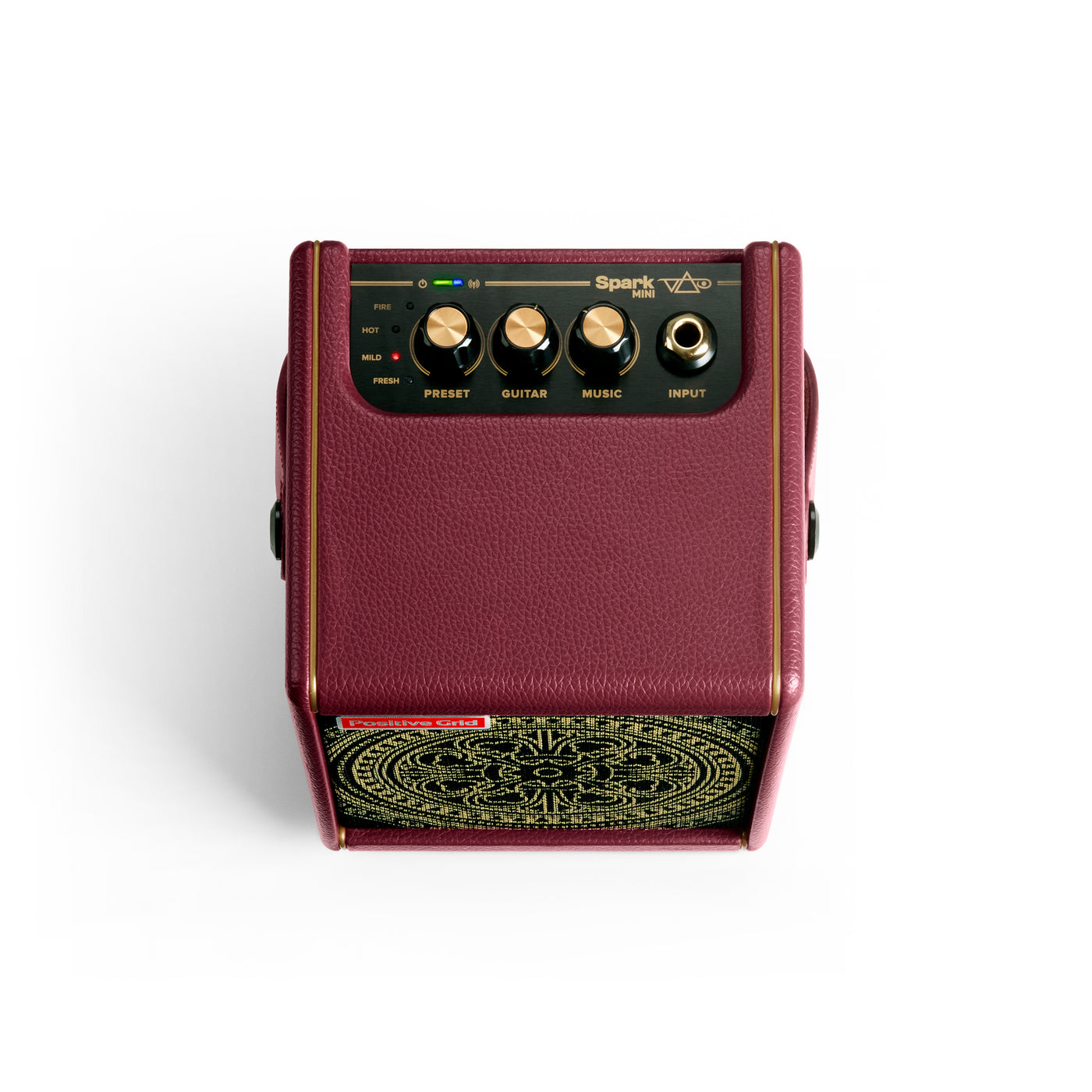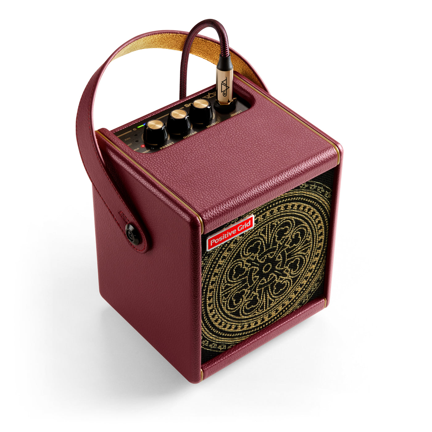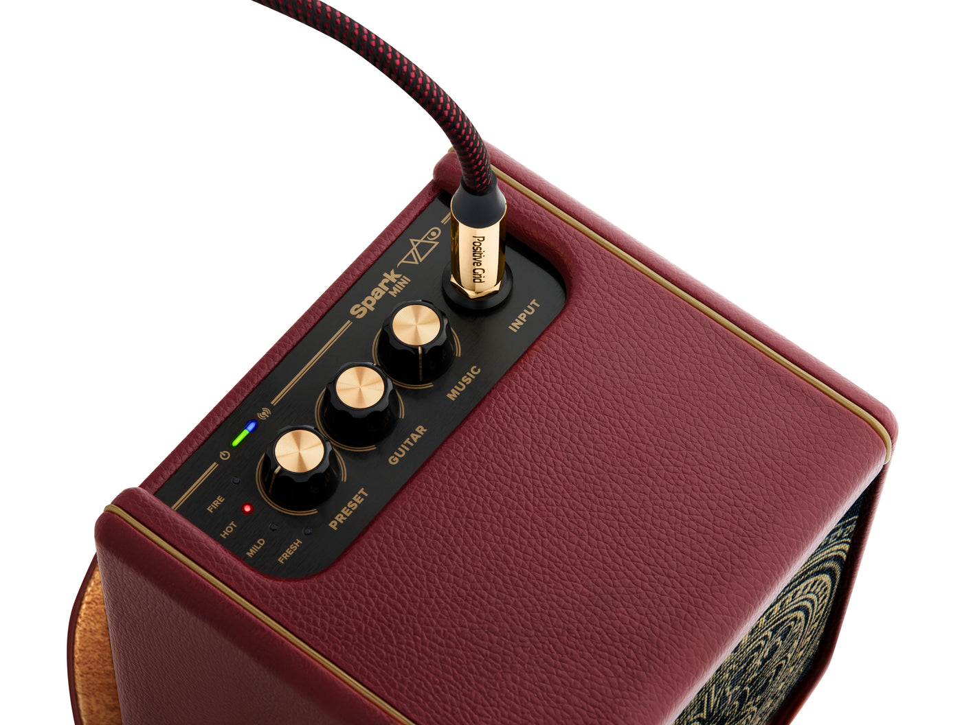 A first for Spark series custom amps, Spark MINI Vai comes equipped with a matching lightweight 10 foot guitar cable, featuring 24K gold-plated connectors and wrapped in a durable burgundy weave nylon jacket.