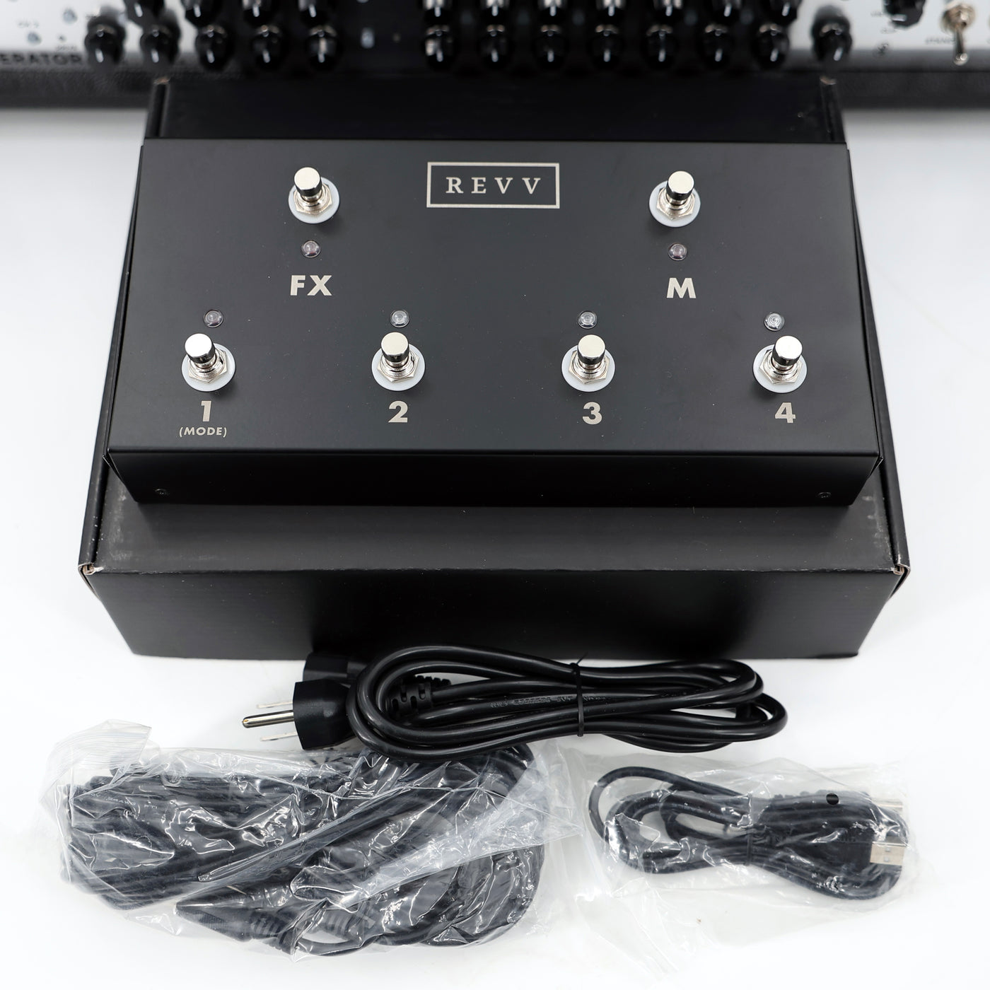 • Design: Tube• Channels: 4: Blue clean, Green crunch, Purple tight gain, Red saturated gain. • Power Rating: 120W (adjustable to 10W)• Preamp Tubes: 5 x 12AX7• Power Tubes: 4 x 6L6• Clean Tone Controls: 3-band EQ, Level, Bright Switch, Wide Switch• Crunch Tone Controls: 3-band EQ, Level, Gain, Bright Switch, Drive Switch (3 voices)• Gain Channel Tone Controls: 2x (independent): 3-band EQ, Level, Gain, Bright Switch, Cut Switch, Fat Switch, Aggression Switch (3 voices)• Global Tone Controls: Master Volume 1 & 2, Presence, Depth, Reverb switch, Noise Gate switch.• Utility Controls: Reverb Level, Direct Output Level, Virtual Cabinet Rotary Selector, Noise Gate Threshold.• Direct Capabilities: Stereo Two notes Torpedo-Embedded reactive load & dynIR Virtual Cabs• Preset Virtual Cabs: 6 w/ rotary switch, 128 w/ MIDI presets• Additional Features: Pre/Post switch, digital reverb, noise gate, ground lift, speaker/load switch• Outputs: 2x 1/4" 4 ohm, 2x 1/4" 8 ohm, 1x 1/4" 16 ohm (cabinet); Stereo XLR (Torpedo out)• Headphones: 1/4" jack headphone amp w/ adjustable level & clip warning LED• Effects Loop: Yes, buffered• MIDI I/O: 2 x Type B (in & thru)• Other I/O: 1 x 5-pin (Revv cabinet lighting), Revv footswitch jack• Connectivity I/O: USB Type B & Bluetooth for Virtual Cabinet & preset adjustment• Bias: Easy-access adjustable fixed bias w/ easy-access fuses• Construction: Baltic birch tolexed headshell• Power Cable: Standard IEC AC cable• Dimensions H x W x D: 10.5" x 26.5" x 10"• Weight: 46 lbs• Footswitch: 6-button, programmable, included
