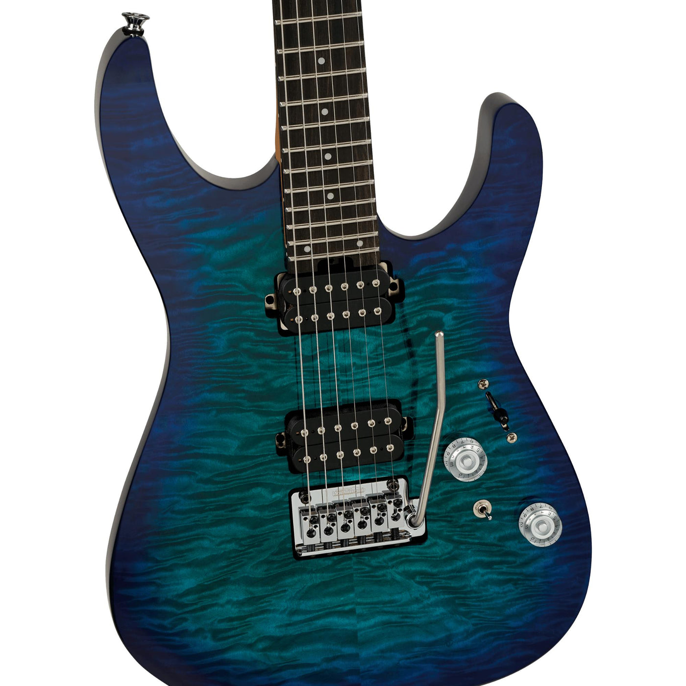 Loaded with premium features, this Pro-Mod Plus Dinky DK24 2PT model features a sleek Dinky body constructed from basswood with a quilt maple top, sculpted shredder's cut heel and scalloped lower back bout for seamless access to the upper registers. The bolt-on caramelized maple neck features graphite reinforcement for rock-solid stability, a satin natural finish on the back of the neck for sublime playability, and a conveniently located heel-mount truss rod adjustment wheel for neck relief tweaks on the fly. Designed for speed, the 12"-16" compound radius ebony fingerboard features comfortable rolled edges, 24 stainless steel jumbo frets and Luminlay side-dots for enhanced visibility in low-light conditions.