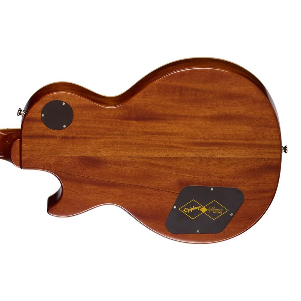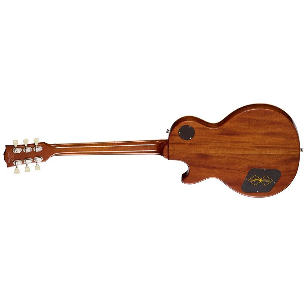 The one-piece genuine mahogany neck has a 50s Rounded Medium C profile and a long neck tenon for excellent stability and sustain. The bound rosewood fretboard is adorned with mother-of-pearl trapezoid inlays and equipped with 22 medium jumbo frets, just like the original models from 1957. It has an aged mother-of-pearl Epiphone logo and the words “Les Paul Model” silkscreened in gold on the Gibson-style “open book” headstock. Even the side dot position markers are the same size as on vintage 1957 Les Paul Standard models and are placed in historically accurate locations.