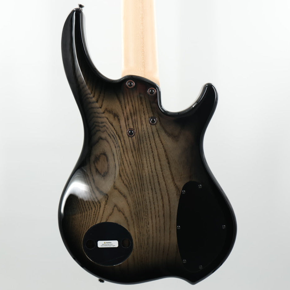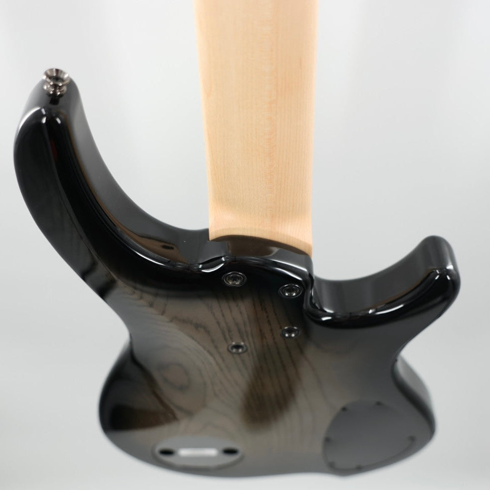 Dingwall Left-Handed Combustion 3X 5-String Multi-Scale Bass - 3-Pickup Quilt Top 2-Tone Blackburst w/Maple FretboardDingwall basses have been synonymous with great tone, definition and the “Best B in the business!” When bass players purchase or switch to a Dingwall they hear nothing but praise from the sound engineers both live and in the studio. The reason being that they naturally sit in the mix.Why?Because of the fan fret system. It’s all about the great fundamental tone it produces.- Equalized tension from string to string.- Strong fundament tones without bad harmonics or overtones.- No more floppy B string.If you look in a grand piano you’ll see that the low strings are longer and the high strings are shorter. This produces the right tension and proper length for each of the notes to ring true.Now look at the Dingwall fan fret bass. Notice how the lowest, thickest strings are longer and the higher thinner strings are shorter, just like a grand piano. This string length produces the clarity and definition Dingwall is known for.Scale Lengths and DimensionsFingerboard Radius:Combustion Fingerboard radius – 240 mm (9.45”)The Combustion bass features a single radius (240 mm) fingerboard. This makes for a very comfortable playing experience. Scale Lengths - 5 string model - B E A D GB - 37"E - 36.25"A - 35.5"D - 34.75"G - 34"DimensionsBridge spacing - 18 mm – .709"Nut width - 45.5 mm – 1.8"Heel width - 75 mm – 2.95"Neck thickness @ 1st fret - 21 mm – .827"Neck thickness @ 12th fret - 24 mm – .945"Body2-3 pc Swamp Ash body, Matte Black pickguard. Smoked Chrome Hipshot/Dingwall hardware.Body Core - The average weight of the Combustion is a low 8.75 lbs.Finish - The Gloss Combustion finishes are a polyester base topped with polyurethane color and top coats. This industry standard finish is long-wearing and beautiful for years of service life.Color - 2-Tone Blackburst (Quilt maple top)NeckDingwall takes neck construction very seriously due to their extensive experience in guitar repairs coupled with their geographic location and corresponding extreme climate. They’ve experimented with many different lamination and have found a 5-piece maple construction to be among the best.Neck ConstructionIn Dingwall's years in the guitar repair business they constantly had to deal with humidity related problems made worse by the huge temperature and humidity swings of their local climate. Many of these problems could have been minimized through simple design changes and materials choices.Touring musicians are constantly amazed at how stable Dingwall instruments are. Many state that their Dingwall necks are as stable as their graphite necked instruments.Dingwall has experimented with many different laminations and have found a 5-piece maple construction to be among the best. Years of experience have proven this design to be extremely stable and reliable.Neck Carve - Medium thin C shapeNeck Reinforcement - Heavy duty truss-rodHeadstock - Headstock design – Flat, string retaining bar. They combined the minimalist shape of the Afterburner headstock with the lightest import tuners they could find. The results are excellent balance and solid performance.Fingerboard - MapleFrets - Dingwall uses 18% hard nickel silver fretwire. Lee Sklar turned them onto the benefits of small frets. The advantages are a more woody, less metallic tone, smoother glissandos and a faster feel. Their standard size is “banjo” size. This is the same size as you’d find on most guitars from the 50’s and 60’s. Although its size is smaller than standard bass fretwire, its service life is about the same.Position Markers and Inlays - 3 mm plastic face dots, 2 mm plastic side dots.ElectronicsPickups - The FD-3N pickups are made to Dingwall's specifications. They feature Neodymium magnets which offer high output and a smooth but aggressive tone.Pickup Configuration - 3 pickup neck/middle/bridgeStandard Electronics - EMG 3-band, FD-3n pickups, Vol, rotary pickup selector, Bass, Mid, Treble, Active/Passive switchPickup Switching - Rotary pickup selector.Knobs - The Combustion now features Smoked Chrome knurled push-on knobs.Jack - The jack is one of the most critical electronic components of a bass. It’s the most likely to suffer abuse so needs to be rugged in order to be reliable. They wanted the Combustion to be as reliable as it is great sounding and looking so they install the amazing socket style jack plate with a Switchcraft brand jack.HardwareHardware color - Smoked ChromeTuners - Dingwall tested a lot of tuners when designing the Combustion. They were able to find an open-back tuner that met their requirements of light-weight and smooth feel. These tuners will provide years of trouble free performance. They also chose them to have the exact same hole specifications as both Gotoh and Hipshot tuners so replacement or upgrades down the road are a simple process.Bridge - Dingwall started with an available bridge/saddle system that met their requirements for lock-down solid performance and great tone. Then they improved on it by designing a custom riser system to provide increased range of action adjustability.Strap Pins - Standard