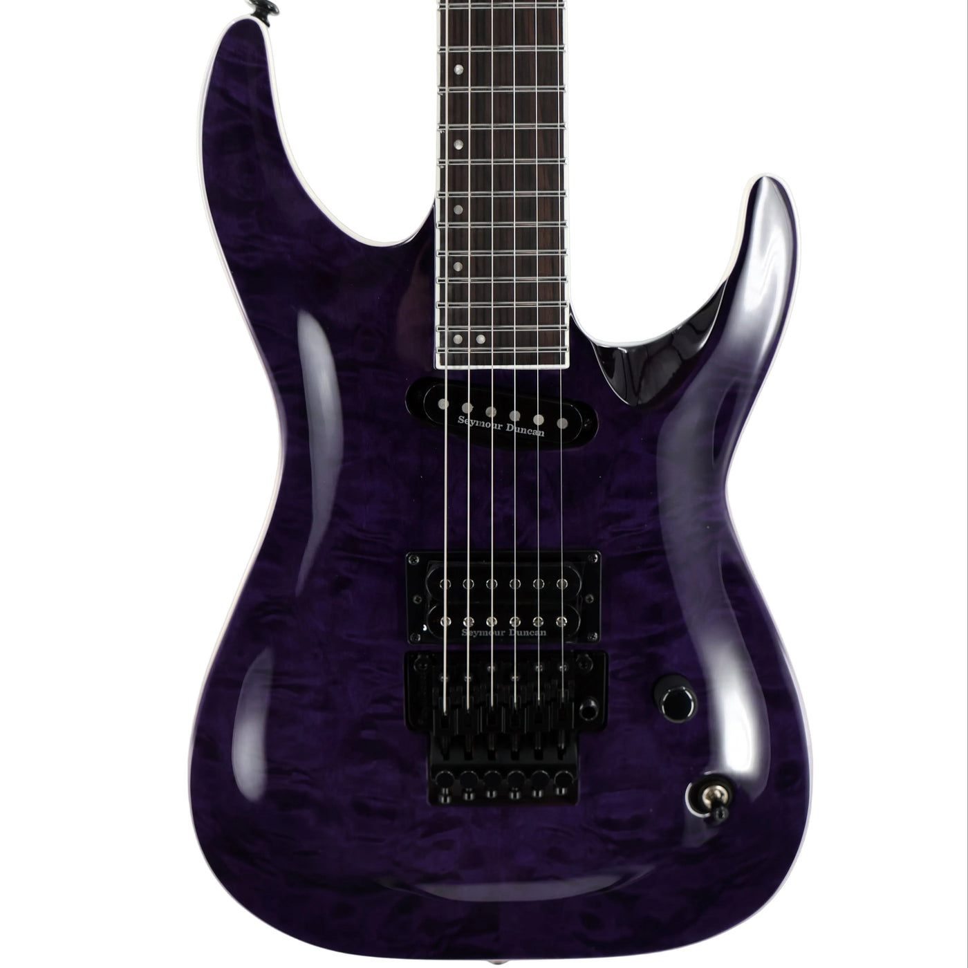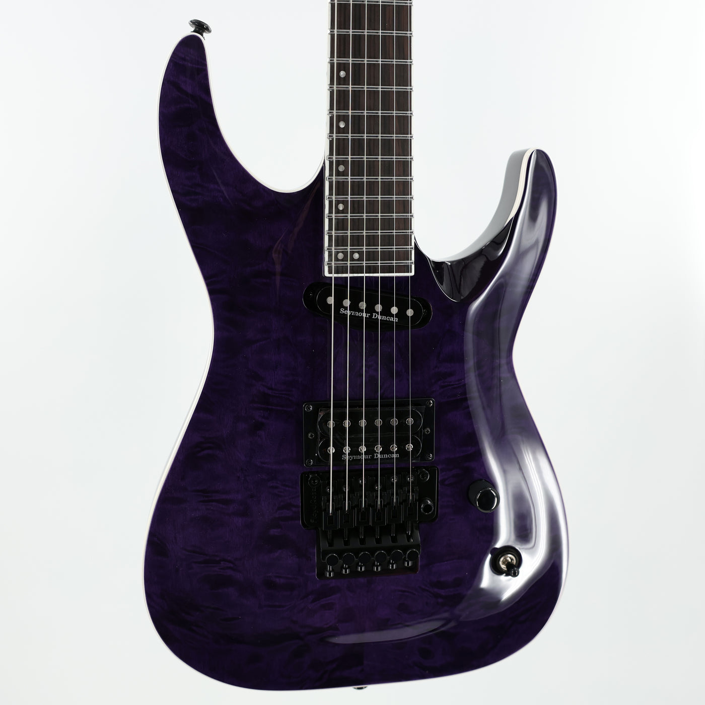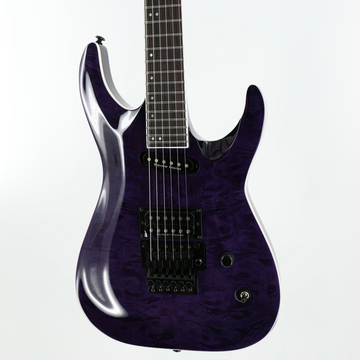 • CONSTRUCTION: Neck-Thru• SCALE: 24.75"• BODY: Mahogany• TOP: Quilted Maple• NECK: 3Pc Maple• FINGERBOARD: Macassar Ebony• FINGERBOARD RADIUS: 300-400mm Compound• FINISH: See Thru Purple• NUT WIDTH: 42mm• NUT TYPE: Locking• NECK CONTOUR: Thin U• FRETS/TYPE: 24 XJ Stainless• HARDWARE COLOR: Black• STRAP BUTTON: Standard• TUNERS: LTD Locking• BRIDGE: Floyd Rose 1000• BRIDGE PU: Seymour Duncan JB• NECK PU: Seymour Duncan Custom Stack Plus• ELECTRONICS: Passive• ELECTRONICS LAYOUT: Volume/Toggle Switch• STRINGS: D'Addario XL120 (.009/.011/.016/.024/.032/.042)• CASE: MH Guitar Form Fit Case• CASE INCLUDED: Yes
