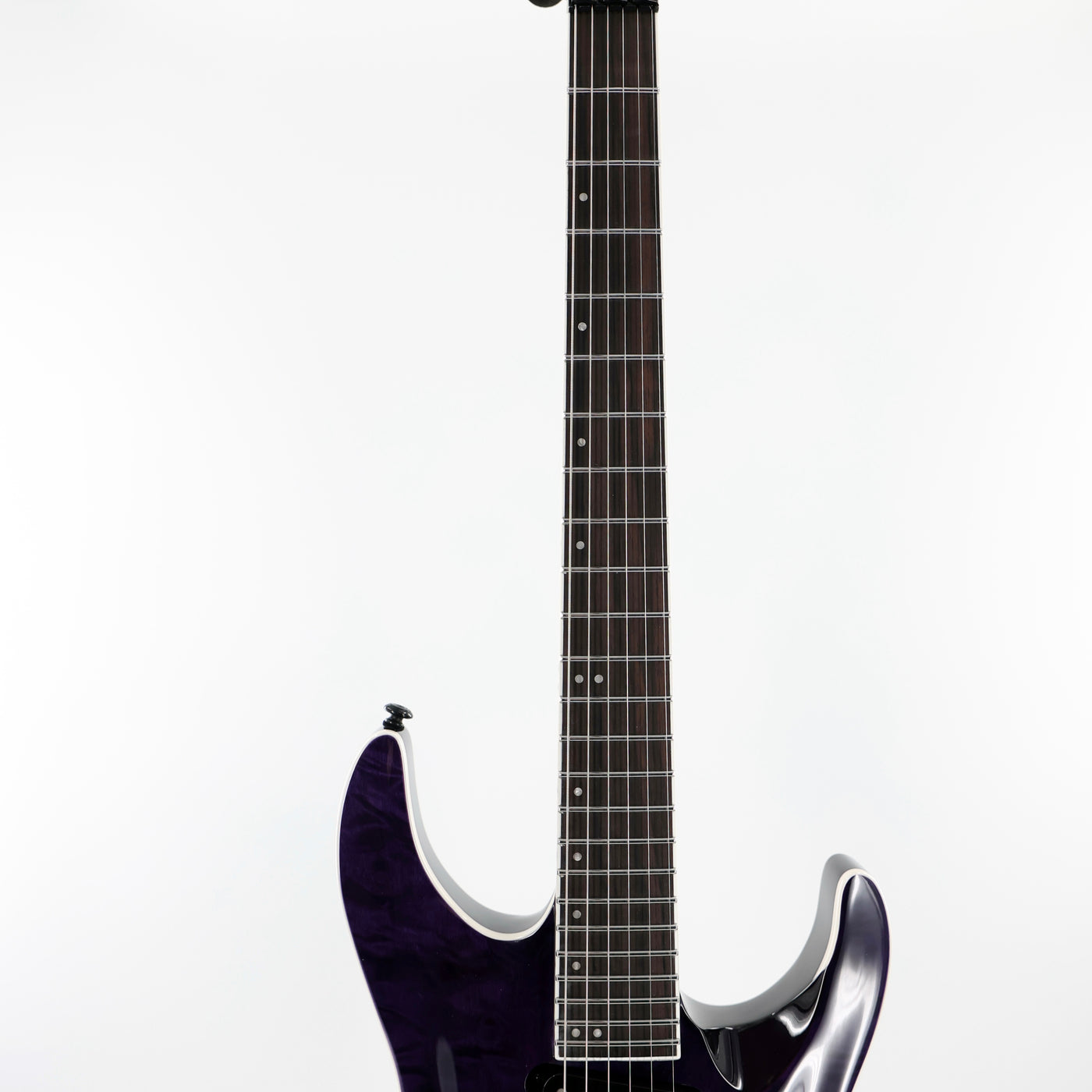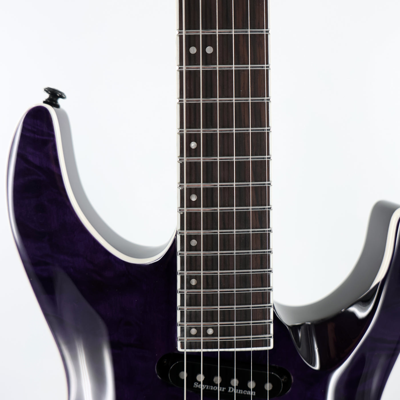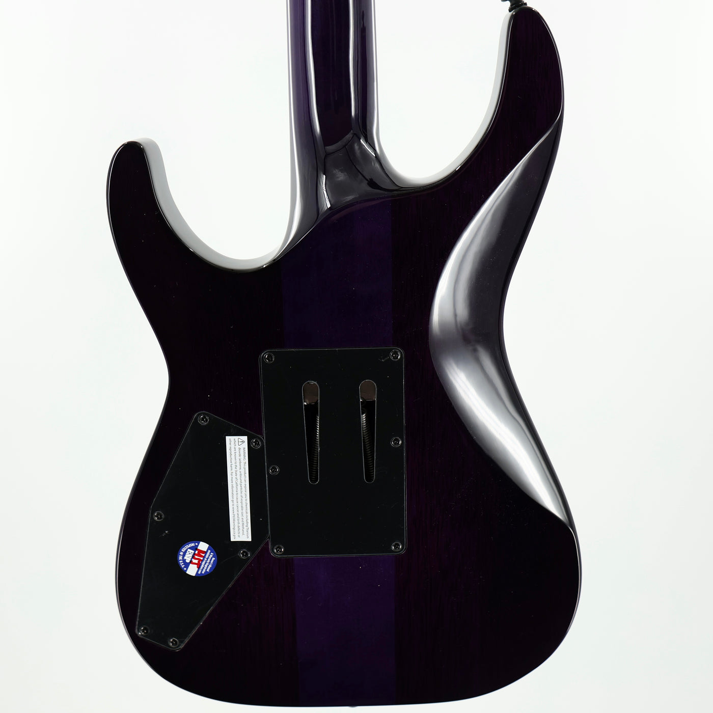 • CONSTRUCTION: Neck-Thru• SCALE: 24.75"• BODY: Mahogany• TOP: Quilted Maple• NECK: 3Pc Maple• FINGERBOARD: Macassar Ebony• FINGERBOARD RADIUS: 300-400mm Compound• FINISH: See Thru Purple• NUT WIDTH: 42mm• NUT TYPE: Locking• NECK CONTOUR: Thin U• FRETS/TYPE: 24 XJ Stainless• HARDWARE COLOR: Black• STRAP BUTTON: Standard• TUNERS: LTD Locking• BRIDGE: Floyd Rose 1000• BRIDGE PU: Seymour Duncan JB• NECK PU: Seymour Duncan Custom Stack Plus• ELECTRONICS: Passive• ELECTRONICS LAYOUT: Volume/Toggle Switch• STRINGS: D'Addario XL120 (.009/.011/.016/.024/.032/.042)• CASE: MH Guitar Form Fit Case• CASE INCLUDED: Yes