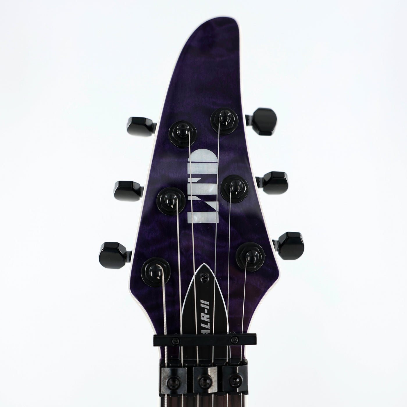 The new LTD ALR-II is the long-awaited Signature Series guitar for Andy LaRocque, music producer and influential guitarist for the iconic heavy metal band King Diamond. Based on the Horizon body, the ALR-II offers neck-thru-body construction at 24.75” scale, and is distinctively finished in See Thru Purple over its figured quilted maple top with a classic teardrop headstock. It features a three-piece maple neck, a Macassar ebony fingerboard with a compound radius and 24 extra-jumbo stainless steel frets, Luminlay side markers, a Floyd Rose 1000 double-locking tremolo, and a set of Seymour Duncan TB-4 JB Trembucker (bridge), and STK-S6 Custom Stack Plus (neck) passive pickups. Includes ESP hardshell form fit case.