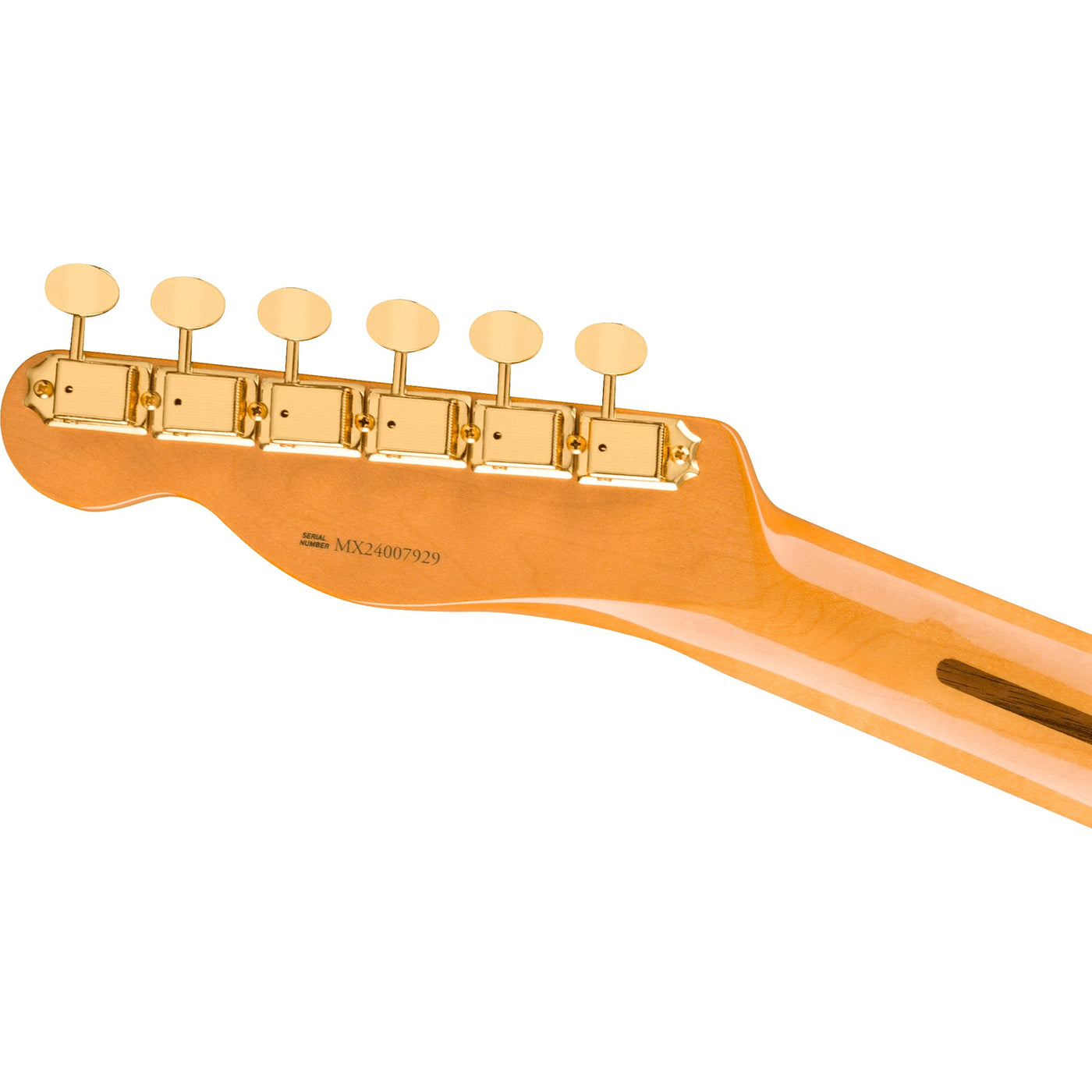 The Buck Owens Telecaster features an alder body finished in signature red, silver and blue sparkle with double white binding for the iconic look of Buck's custom Tele. The late '50s "C"-shaped maple neck features 7.25" radius maple fingerboard with 21 vintage frets, with a matching three-color sparkle finish headstock. Equipped with custom Buck Owens Alnico 3 and Alnico 2 single-coil Tele pickups, this guitar delivers the bright, cutting tone that defined Buck's Bakersfield country sound. Other features include lustrous gold vintage-style hardware, from the 3-saddle strings-through-body bridge to the knurled flat-top knobs and gleaming gold mirror pickguard.