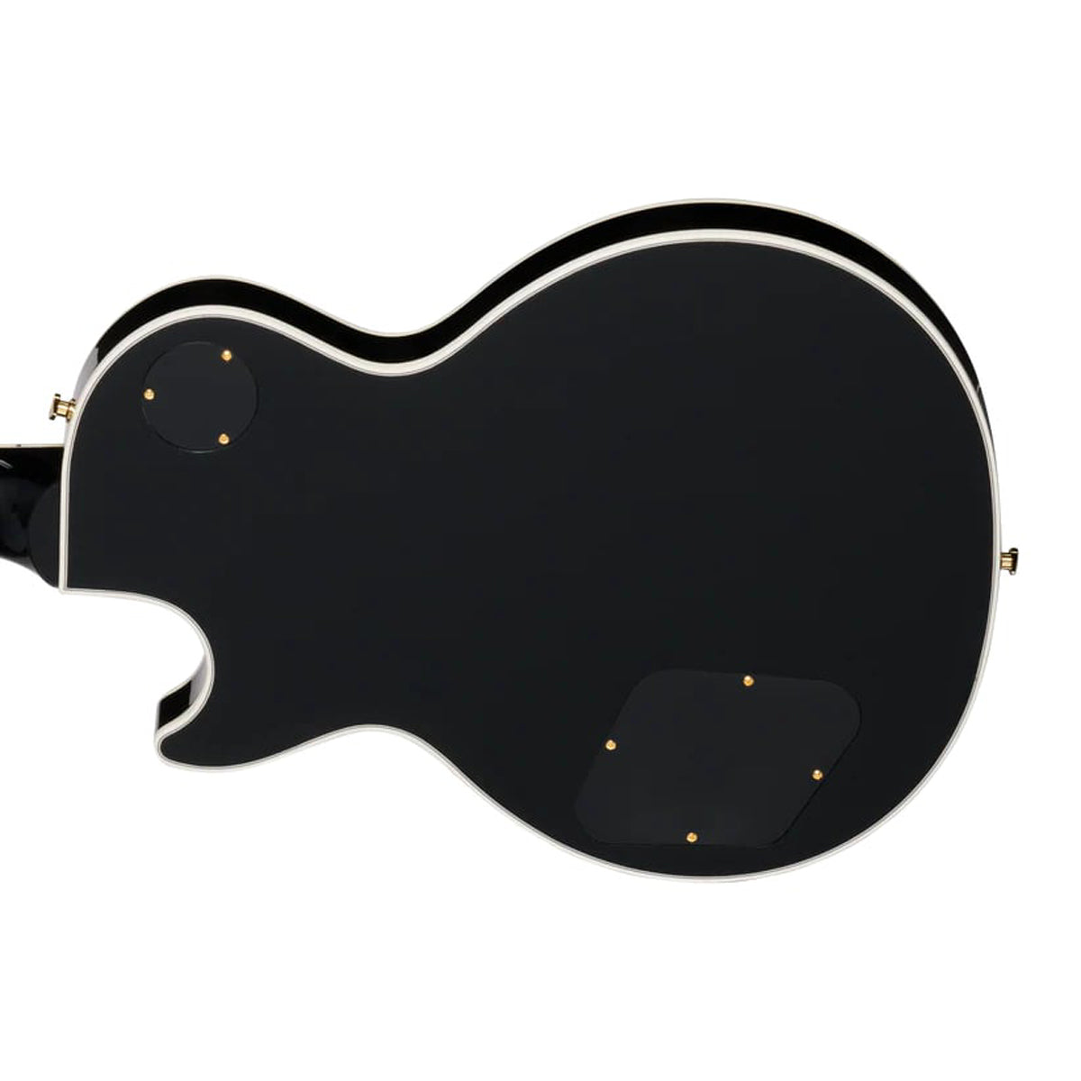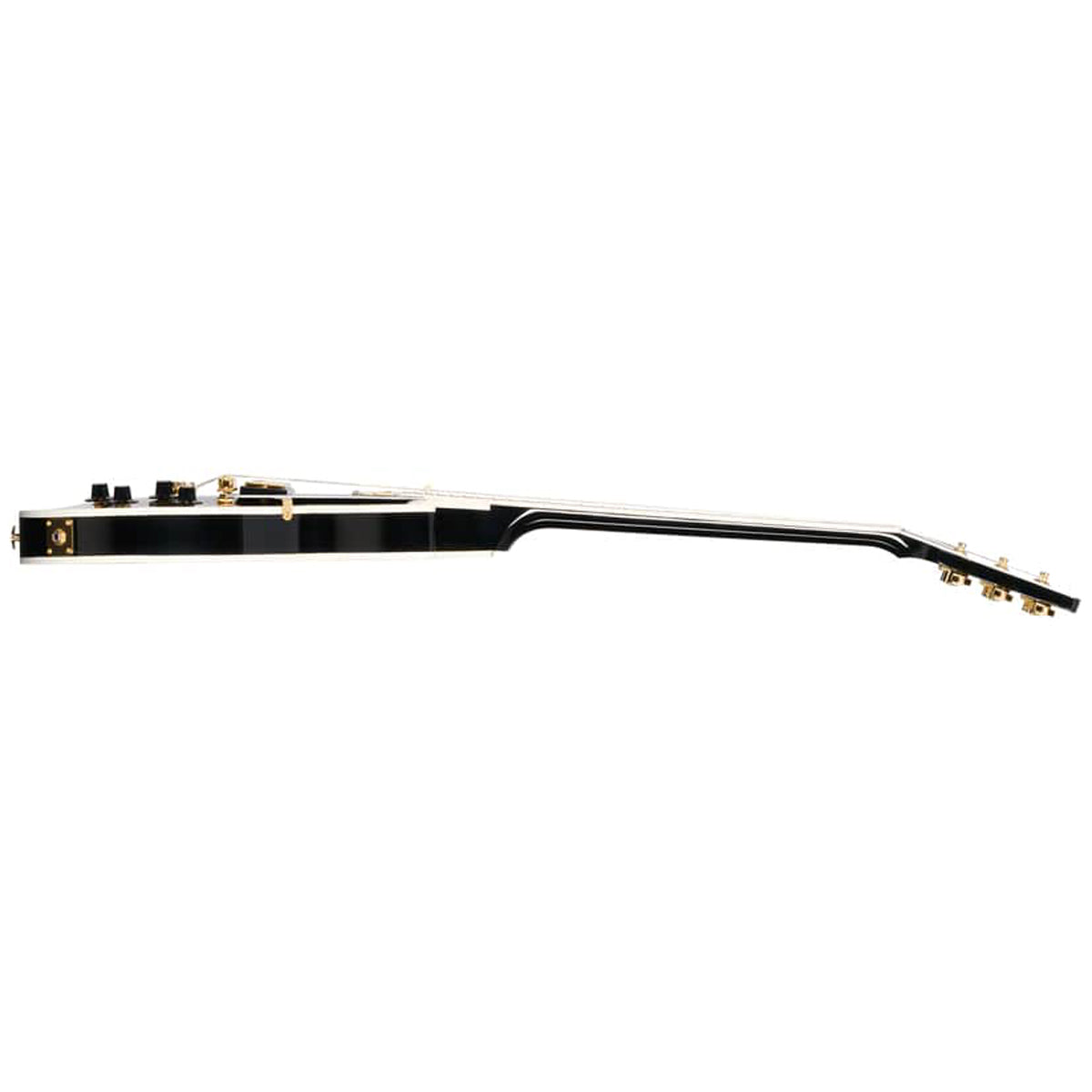 The body is bound with 5-ply top binding and 3-ply back binding. The maple neck has a 70s profile and a volute and is topped with a bound ebony fretboard with 22 medium jumbo frets and mother-of-pearl block inlays. The bound headstock is also adorned with mother-of-pearl in the form of the famous Custom Split Diamond mother-of-pearl headstock inlay, which originated with the Gibson Super 400 and has become synonymous with the Les Paul Custom.