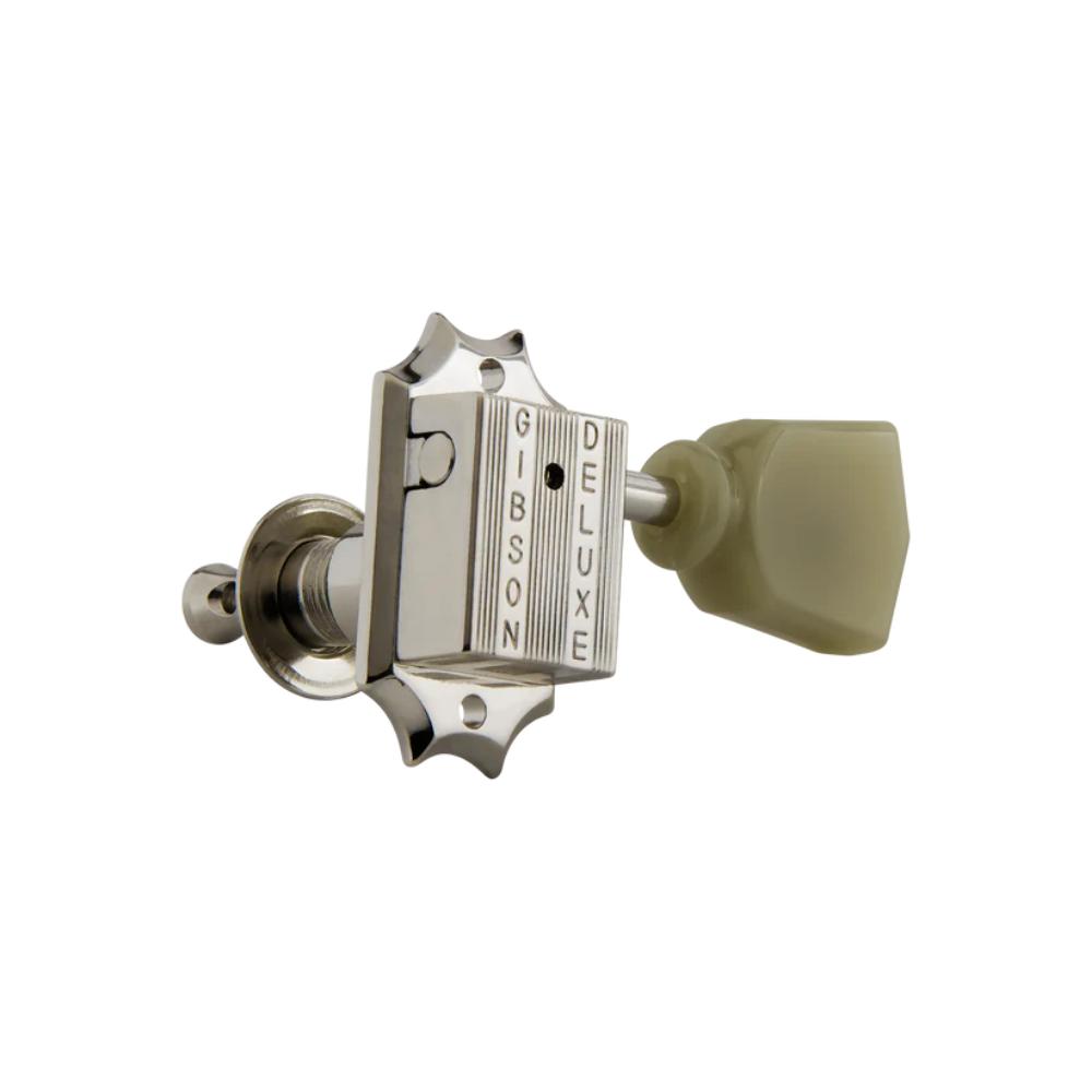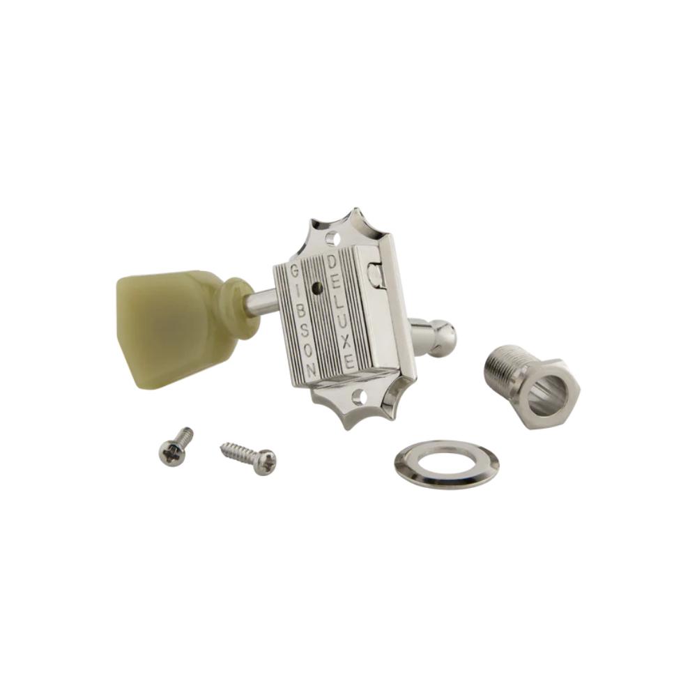 Gibson's vintage machine heads with pearloid buttons feature solid nickel, closed housing construction, period-correct vintage styling, and traditional pearloid buttons that deliver precise tuning, while adding a luxurious, classic feel to your guitar's headstock.